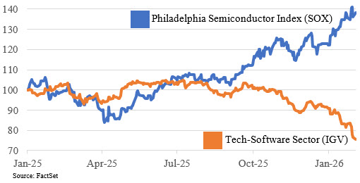 It should come as no surprise that Artificial Intelligence (AI) has loomed large during earnings season, with some of the “Magnificent 7” and other leading companies reporting their results. The AI story continues, as large companies increase their capital spending plans in the rush to build capacity. In that environment you might expect that every company in the technology world would benefit and see their stock prices rise accordingly. That, however, has not been the case. Instead, there has been a dramatic dichotomy between companies providing the technological “picks and shovels” for that increased capacity spend, in other words semiconductor and related companies, and software companies expected to offer new products and services once the AI infrastructure build is complete.